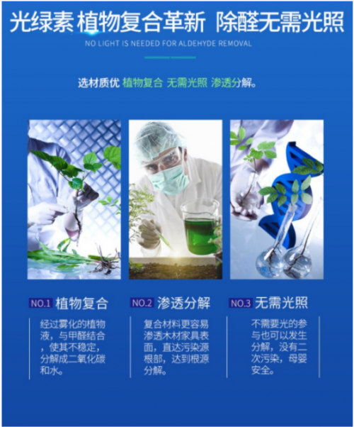 光绿素与甲醛分子结合,分解成二氧化碳和水,整个过程不需要光的参与,这样可以有效防止二次污染。其超强渗透性又可以穿透表面,直达污染源根部,从而达到更有效的甲醛治理。