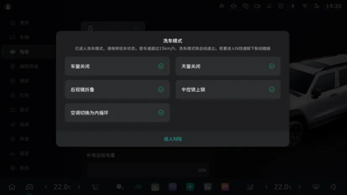 自动洗车不手忙脚乱,洗车更省心。一键折叠后视镜,关闭车窗、天窗,空调切换内循环,中控锁上锁;支持一键切换N档并释放电子手刹。