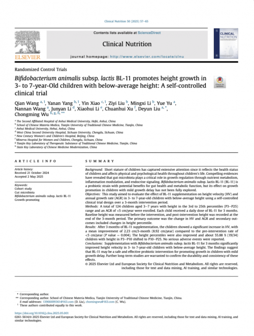 在最新的临床试验中,赛哺高®BL-11益生菌对身高处于同龄人P3-P25百分位(即低于平均身高但未达矮小症标准),年增速<5厘米的儿童进行干预,结果显示12周平均增高2.23厘米,年化增速达8.92厘米,相关研究成果发表于国际权威期刊《ClinicalNutrition》。此外,“动物双歧杆菌乳亚种BL-11”干预矮身材多种适应症的篮式研究已进入伦理会流程,将由华中科技大学同济医学院附属同济医院担任牵头单位,并有苏州大学附属儿童医院、武汉儿童医院、河北医科大学第一医院、江西省儿童医院等多家医院共同参与。