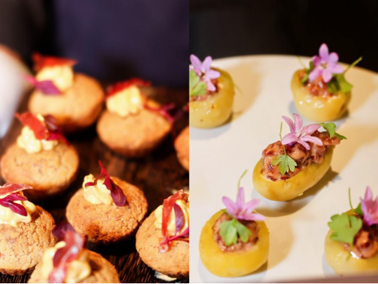 (主厨Guy Ravet现场烹饪的“法国干酪火腿泡芙”和“云南土豆佐和牛黑松露塔塔”)