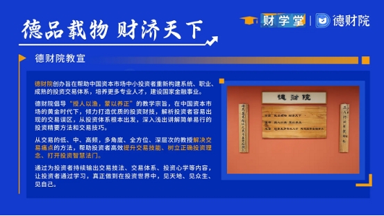 德财院作为国内领先的财经教育平台,秉持“授人以渔,蒙以养正”的宗旨,致力于为中小投资者提供系统化、职业化的投资交易体系教育。通过实践技法、交易体系与投资心学的综合输出,助力投资者在投资世界中“见天地、见众生、见自己”。