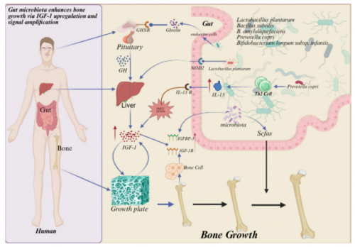 如今,赛哺高BL-11菌株的作用机制已通过基础研究明确:基于“肠-骨轴”理论,通过调控肠道菌群改善孩子食欲,增加营养物质摄取并帮助消化吸收,同时改善营养利用模式,产生更多短链脂肪酸等物质,分解转化更多营养物质供给骨骼健康发育,进而促进生长因子 IGF-1 产生,还能通过改善肠道菌群结构和功能,增加有益菌、减少有害菌,调节肠道PH;赛哺高BL-11在促进肠道发育,减少儿童过敏、免疫、炎症等相关疾病发生的同时增加对营养物质的吸收和利用,促进关键营养调控因子的基因表达,可减少炎症因子对IGF-1分泌的影响,为生长发育提供多重动力,最终实现儿童身高增长的科学支持。