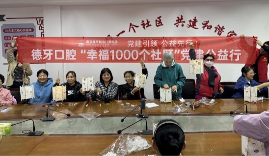 德牙口腔自建院之日起便成立了党支部,组建了一支思想觉悟高、行动能力强、为市民办实事的党群服务团队,为幸福南京做贡献。发起了“幸福1000个社区”大型公益活动;持续走进社区和企业举办口腔健康公益科普讲座、文艺演出、公益义诊、社区文化节等各类型活动,丰富居民们的日常文化生活,寓教于乐,让居民在丰富多彩的活动中学习科学口腔健康知识,提升口腔健康意识。致力于做一家永远受人尊敬、被社会需要的101年德系口腔医院。