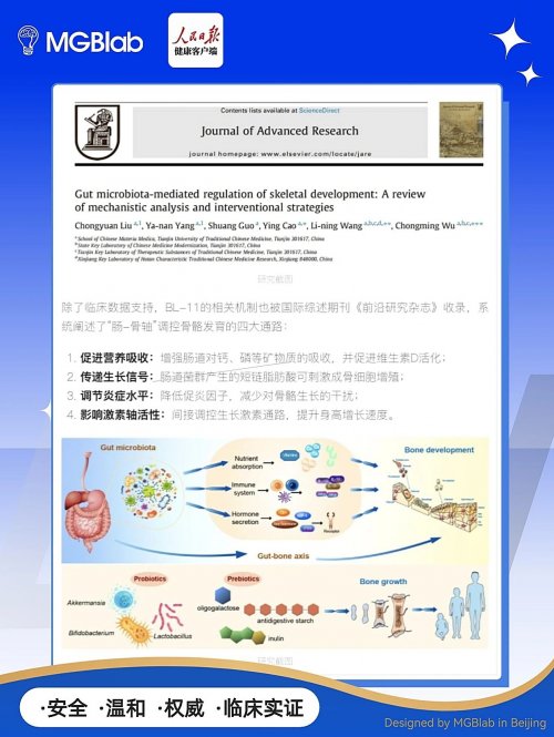 对于多菌株组合需循证支持的建议,赛哺高依托MGBab菌肠脑实验室的协同益生菌AI(CFP AI)协同配方平台,始终以“科学证据”为组合逻辑:针对用户的不同需求,优先选择满足交叉喂养效应、生态位互补和代谢物增效的益生菌菌株,最终以多中心RCT验证菌株功效;而这种“三重锁效菌群协同技术”恰好又与《益生菌菌株复配的专家共识》完全对应。同时,MGBlab通过自主的SMART大模型平台,整合50万+临床、多组学、真实世界数据及用户数据,完全规避 “经验型组合”,与建议倡导的科学路径高度契合。除了临床数据支持,赛哺高BL-11的相关机制也被国际综述期刊《前沿研究杂志》收录,系统阐述了“肠-骨轴”调控骨骼发育的四大通路: