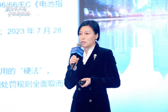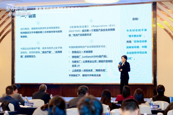 在随后的主题分享环节中,君合律师事务所合伙人易芳律师分享了“新能源电池出海与《欧盟电池法案》的机遇与重塑”。易律师首先介绍了《欧盟电池法案》Regulation (EU) 2023/1542的立法背景、立法情况、覆盖电池类型,重点说明了合规义务与生效时间节点。随后,易律师细致讲解了四个核心事项合规落地路径:碳足迹申报+供应链尽职调查+EPR+电池护照。