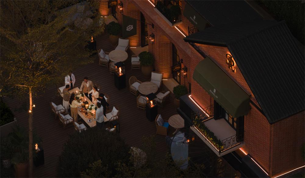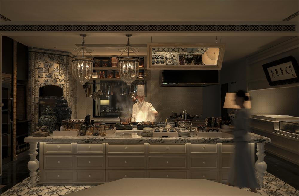 此家新荣记以中国代表性瓷艺——青花瓷为主线,将“文明互鉴”作为空间核心理念,追溯青花瓷跨越数百年的世界旅程,让中西美学、历史与生活方式凝练为空间中可触可感的体验语言。门厅以骑士风度开篇,塑造老钱与新贵相融的从容仪式感;一层延续开放的社交氛围,与户外地中海式的松弛与明亮自然呼应,而KAIKI器会(日料区)以桧木、竹影与庭院光影呈现静雅东方意境。青花纹样同时被拆解为品牌标识系统的视觉语言,罕见古物与CCD设计的原创餐具共同延续青花瓷的文化脉络,使空间在行走间呈现多元文化的渐次铺展。