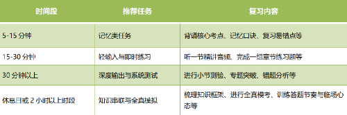 在职备考期间我们很难连续学习4小时,但是我们可以高效利用8个30分钟,关键在于为不同类型的碎片时间匹配合适的学习任务,形成“学习-检测-反馈”的闭环。例如根据不同碎片时长的特点,可以匹配相应的学习任务,以最大化学习效率。具体建议如下表所示: