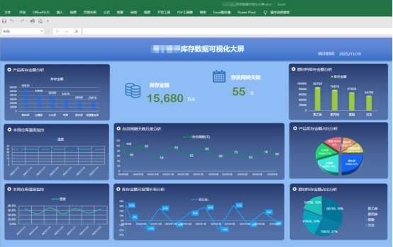 库存管理是塑料制品企业成本控制的重要环节。勤哲Excel服务器通过整合《原材料库存表》《成品库存表》《库存统计分析表》《仓库温湿度监控表》等数据,构建库存数据可视化大屏。系统能够直观展示库存金额、库存结构占比、存货周转天数、库存金额月度增长率以及仓储环境变化情况。库存状态从静态盘点转为动态监控,企业能够更合理地控制库存规模,降低资金占用风险,提高整体周转效率。