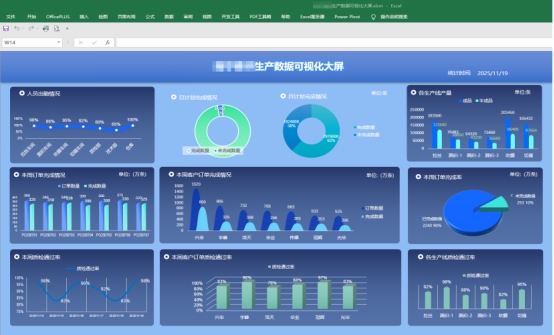 在生产管理方面,勤哲Excel服务器将人员、计划、执行和质量数据进行统一管理。通过自动提取《员工考勤记录表》《生产日报》《生产计划完成状况表》《订单完成状况表》以及质量相关报表,生产数据可视化大屏能够实时反映人员出勤、日月计划完成率、各生产线产量、订单履约情况及质检通过率。生产管理由经验驱动转向数据驱动,企业可以及时发现生产瓶颈和质量波动,提升计划执行的稳定性。