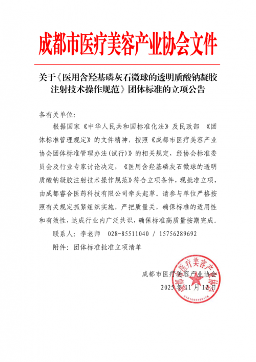 行业的高质量发展,离不开技术操作的标准化与规范化。近日,成都市医疗美容产业协会批准发布了《医用含羟基磷灰石微球的透明质酸钠凝胶注射技术操作规范》团体标准的立项公告,并指定由成都睿合医药科技有限公司作为牵头起草单位。