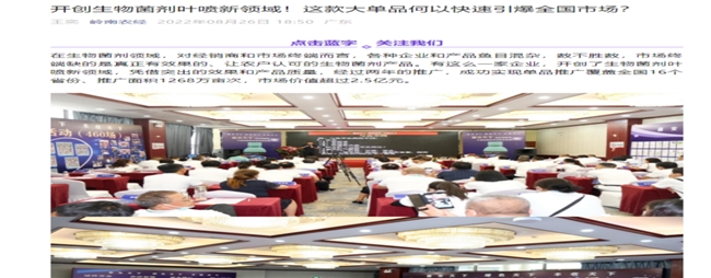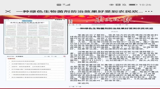菌安天下在农业方面的一直有着突出的发展,2020年12月11日中国农网刊登了菌安天下替代化学农药的实例和专家认可,赞扬值得全国推广。2020年12月25日农民日报也报道了菌安天下研发的新产品的成果,而且2021年8月,还出台一县一乡镇免费送政策,全国多地区域掀起一波叶喷菌剂浪潮,自此奠定《菌安天®下》在叶喷菌剂的开创者地位。