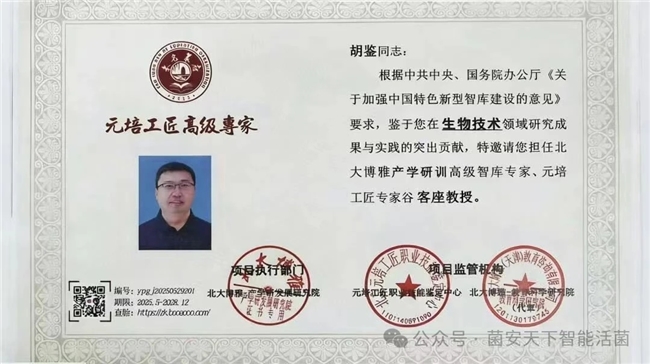 技术研发方面,菌安天下在2025年持续加大投入。公司在“花生冠腐病防治复合微生物菌剂关键技术研究及应用”等方向上取得阶段性成果,相关技术达到国际领先水平,并获得多项发明专利、实用新型专利及团体标准认定。同年,创始人胡鉴先生因在生物菌技术应用领域的持续探索,被特邀担任北大博雅产学研训高级智库专家及元培工匠专家谷客座教授,为企业未来的产学研协同发展奠定基础。