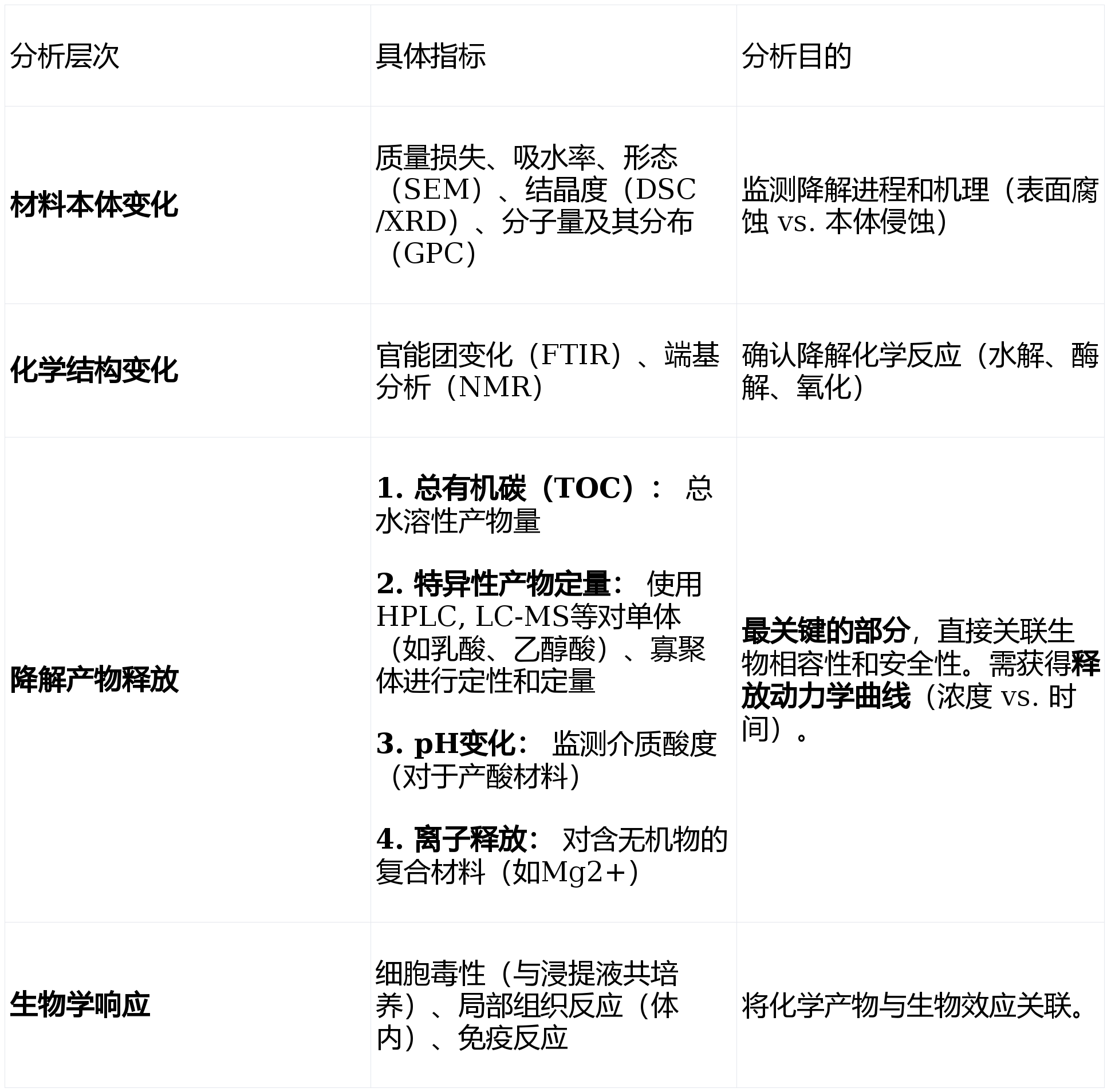 形状与尺寸:比表面积直接影响降解速率。膜、颗粒、多孔支架的降解行为差异巨大。