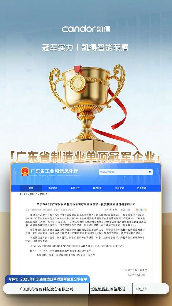 近日,根据广东省工业和信息化厅正式发布的《2025年广东省省级制造业单项冠军企业公示名单》,广东凯得智能科技股份有限公司(简称凯得智能)凭借其核心产品“恒温恒湿红酒储藏柜”成功获评。这一荣誉标志着凯得智能在高端红酒储藏设备细分领域,其技术创新实力、市场领先地位与卓越品质效益,获得了省级层面的权威认可。