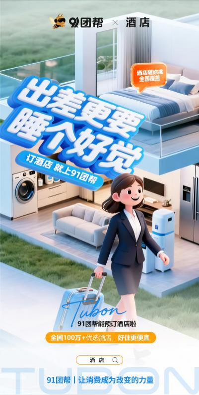 差旅党:高效订房更省钱!临时出差,预算有限?91团帮助你订酒店,商务优选、经济房、交通枢纽周边住宿一键预订,高性价比,告别高价踩坑!年轻人自驾游、穷游,打工人出差,也能睡好觉,轻松恢复满格精力。
