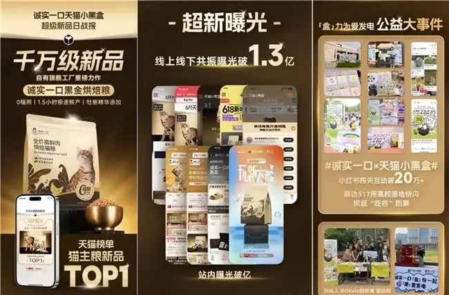 此次合作中,“诚实一口”依托天猫小黑盒的全链路上新能力,结合自身产品实力与公益担当,成功让黑金烘焙猫粮斩获天猫猫主粮新品相关佳绩,成为现象级爆款,也彰显了国产宠粮品牌的发展潜力。