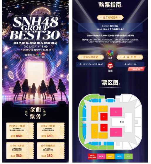 与此同时,SNH48年度盛事“SNH48 GROUP 第十二届年度金曲大赏”也即将开票。这一活动一直是粉丝与偶像之间的重要音乐桥梁,每年都为观众带来无数惊艳舞台。2月11日11:00-2月13日24:00,大麦&猫眼限时8.8折优惠购买内场VIP座票(680元档位)&看台VIP座票(580元档位),2月14日11:00,大麦&猫眼正式售票,更有限量1000-100满减优惠券可领,2026年3月14日 19:00,上海静安体育中心-体育馆,SNH48将与大家一起感受金曲舞台魅力,共度浪漫白色情人节。