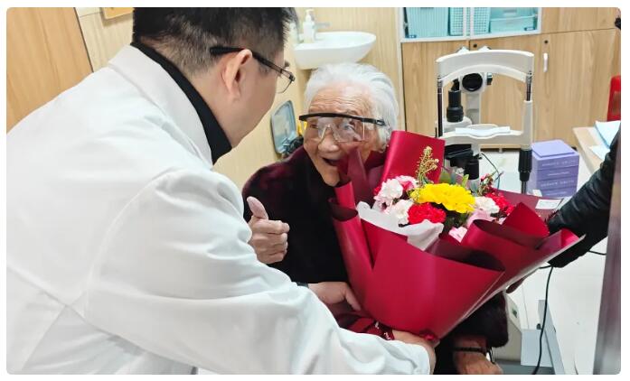 泉州爱尔眼科医院院长吴松一(左)为林阿婆送上鲜花与新春祝福,阿婆开心地竖起大拇指