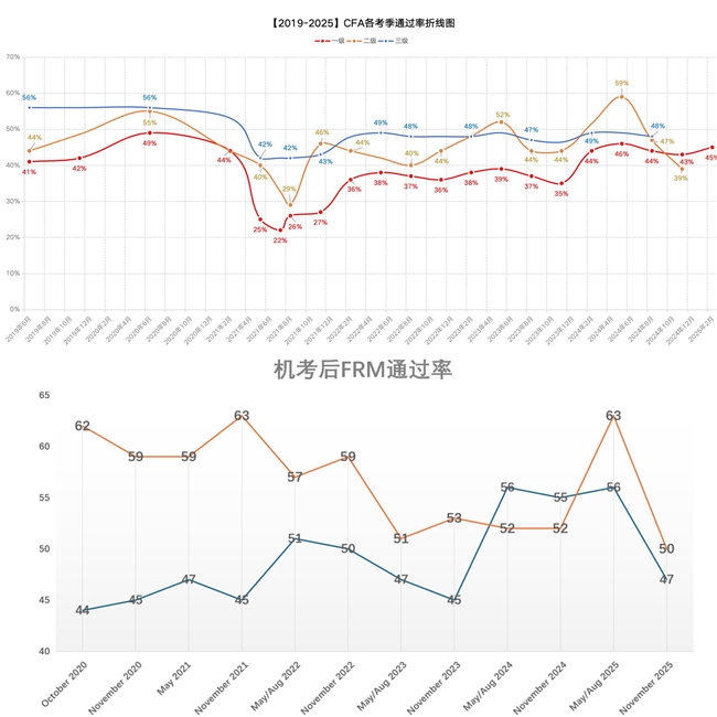 (图:CFA协会与GARP协会公布的近5年各级考试通过率)