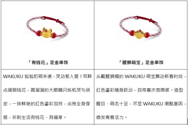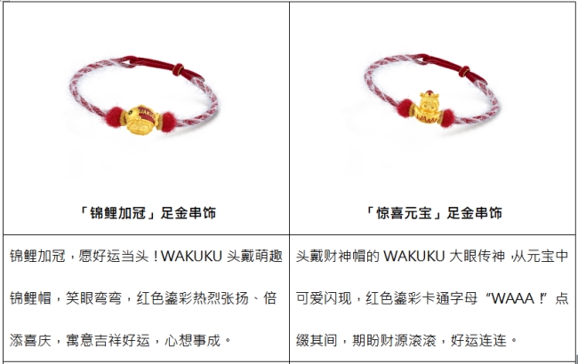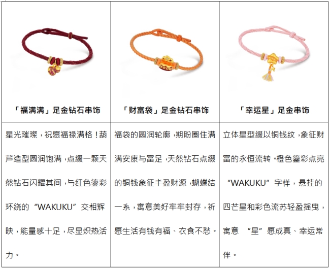 WAKUKU系列涵盖多款萌酷十足的黄金手绳,更特别推出萌暖毛绒手绳与酷感手绳双重选择,满足消费者对个性表达与场景适配的多元需求,风格不设限。萌暖毛绒手绳触感软糯,冬日佩戴温暖舒适,与WAKUKU的可爱气质天然契合,萌力全开!酷感手绳主打简约利落,清爽质感更凸显黄金串饰本身的精致工艺与闪耀光泽,时尚百搭!多款串饰还可自由组合,混搭叠戴。单戴时,祝愿福运聚焦,心意纯粹;叠戴时,祈望福气串联,美好加倍,做到“潮趣由你定义,祝福好运随心叠加”。