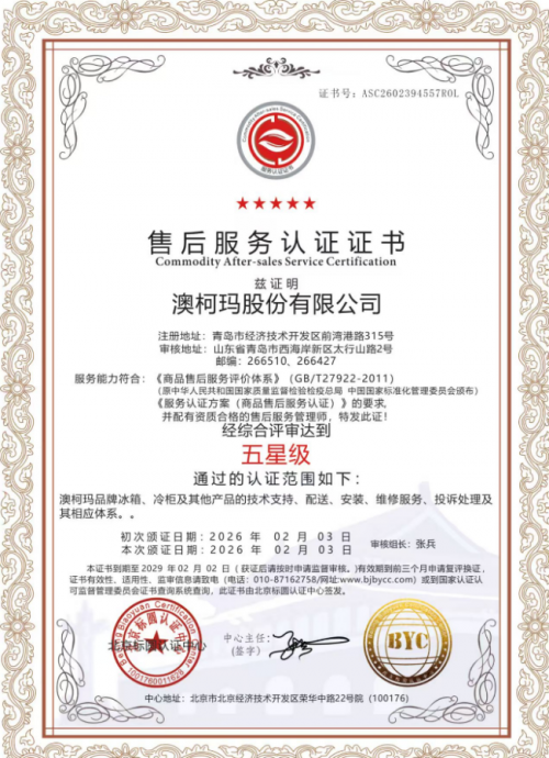 澳柯玛的售后服务体系已通过国家标准GB/T27922-2011《商品售后服务评价体系》认证, 全面达到国标五星级售后服务标准。