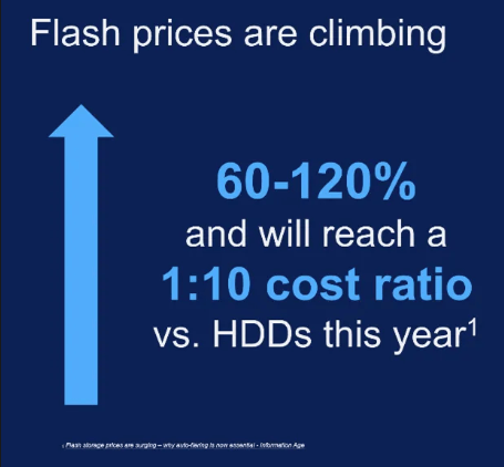 过去几年,行业普遍基于闪存价格持续下行的趋势,而乐观地预计“全闪将全面取代机械硬盘”。因此许多厂商推出的存储平台,如文件存储,也在这一假设下,采用了仅支持闪存介质的全闪架构设计。