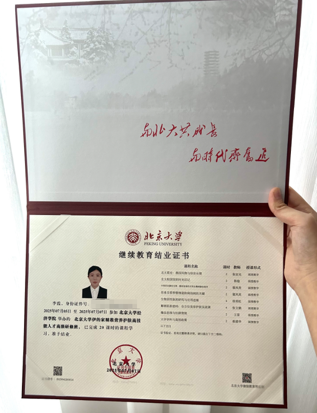 作为深耕行业的专业人士,粥粥的专业实力源于扎实的资质背书与持续学习的态度。她持有美容师三级、高级健康管理师三级、高级公共营养师三级、化妆品配方师高级等多项资质,更曾赴北大研学深造,不断吸纳前沿护养理念与技术,完善自身专业体系。同时,她深入产品原料基地溯源,严格把控产品品质,为VIP提供更安心的服务支持,践行伊的家“品质为本,服务为根”的经营理念。