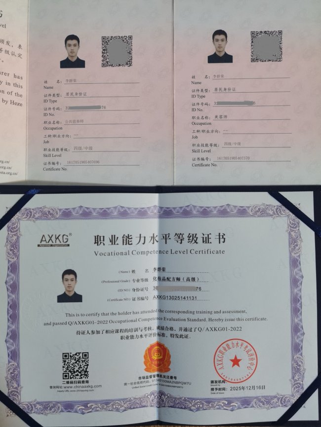 作为一名深耕行业多年的专业护肤达人,李群荣的专业能力有着多元资质的支撑。他持有公共营养师、美容师、化妆品配方师高级等多项权威认证,这些资质让他得以跳出传统护肤的单一维度,将营养管理、体质分析与精准护肤有机结合,形成了“多学科融合”的服务特色,为后续的个性化服务奠定了坚实基础。