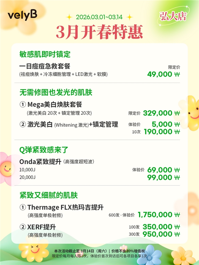 从精准焕肤到分层抗衰,VelyB皮肤科用两大明星项目,诠释了韩国医美“精细化、定制化”的核心价值。在“3月开春特惠”(2026.03.01-03.14)期间,品牌更以诚意价格回馈求美者,让更多人能以亲民成本,体验到专业、安心的韩国医美服务。