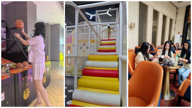 不远处的蹦床区域,藏着满溢的童真与欢喜,是同仁们释放天性、舒缓压力的乐园。挣脱生活与工作的束缚,纵身一跃,在柔软的蹦床上尽情跳跃、翻转,风拂过耳畔,笑声漫过心房,有人舒展身姿,感受腾空而起的自在与畅快,似要挣脱所有桎梏;有人相互比拼跳跃高度,眉眼间满是纯粹的欢喜,偶尔失去平衡摔倒在地,也会笑着爬起来继续,眼底的光芒,比阳光还要耀眼,所有的压力与烦恼,都在跳跃间烟消云散,只留满心澄澈与欢喜。