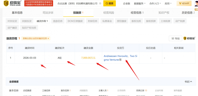 - 合众远景(United Envision)完成7000万元A轮融资,获a16z与Two Sigma Ventures联合2026-03-09