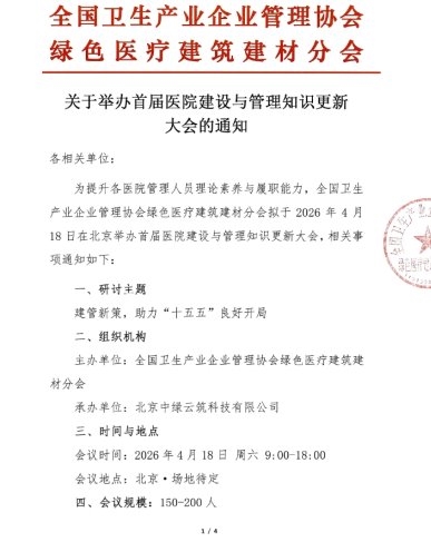 为更好地适应新时代发展需求,助力 “十五五” 规划开好局、起好步,切实提升医疗机构管理人员的理论素养与专业能力,由全国卫生产业企业管理协会绿色医疗建筑建材分会主办的“首届医院建设与管理知识更新大会”于4月18日在北京召开。