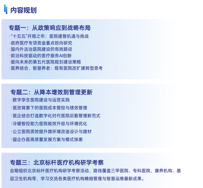 1.政策维度:聚焦“十五五”开局之年,医疗卫生事业发展机遇与挑战,探讨法治医院、智慧医院、医养结合机构等建设与管理模式。