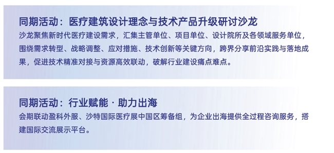 活动同期组织“医疗建筑设计理念与技术产品升级研讨沙龙”与“绿色医疗技术、产品出海公益咨询”两项活动,搭建跨界协同、供需对接、经验共享的国际平台。
