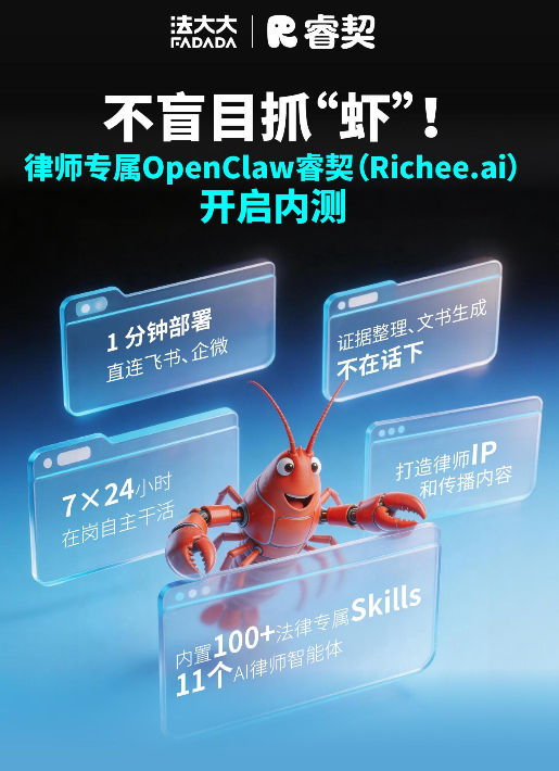 春节后的 OpenClaw (小龙虾)直接引爆了 AI 圈,这股“养虾”热潮无疑是一场认知风暴。当多数大厂还在卷通用大模型的参数规模时,行业真正的机会早已转向了垂直场景和端侧智能。律师这个群体拥有极高的专业门槛,他们对工具的挑剔背后是对“确定性”的极致追求。通用 AI 对法律人而言,就像是用水果刀动手术,既不合规,也不趁手,根本无法切入核心生产力环节,国内头部法律科技公司法大大推出的睿契(Richee.ai),核心逻辑就是要把 OpenClaw 的能力装进法律人的桌面,目前该产品的内测通道已全面打开,这是法律人把握AI红利、实现业务增长重构的关键机会。