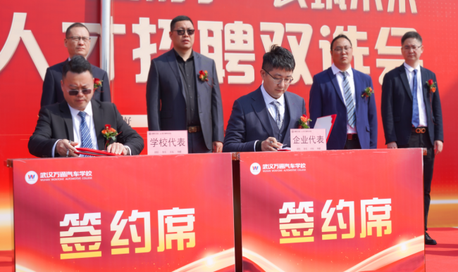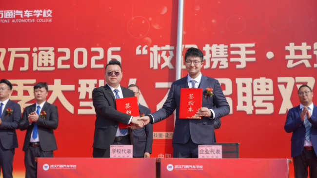 校企合作签约环节将现场氛围推向高潮。武汉万通汽车学校校长助理王修兴代表校方,车之显汽车养护中心董事长陈显鑫代表企业方,共同完成现场签约仪式。此次签约标志着双方正式建立深度校企合作关系,未来将在汽车后市场领域的人才定向培养、专业技术交流、实习就业对接等方面展开全方位合作,为行业输送更多标准化、专业化技能人才,也为双方长远发展筑牢坚实根基,宣告本次校企合作大会圆满成功。
