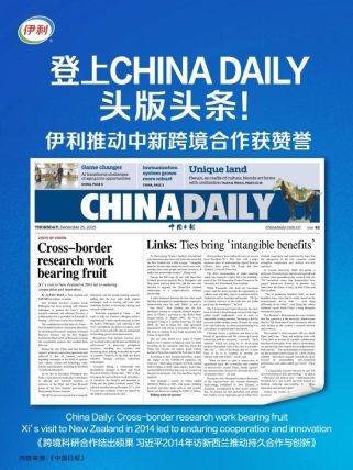 近日,《中国日报》头版头条大篇幅介绍伊利在新西兰的发展成绩。报道高度评价伊利与林肯大学及新西兰科研机构的长期合作,报道认为:伊利大洋洲创新中心是中新合作的“成功实践”,伊利在新西兰的发展是中国企业全球化的“经典案例”。