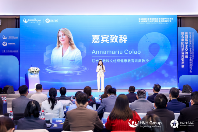 H&H SAC作为健合集团旗下科研学术创新平台,在本次大会中充分展现了强大的国内外高校、科研院所、协会及国际权威资源优势。联合国教科文组织健康教育讲席教授Annamaria Colao通过视频表达了对于与H&H SAC成功合作的喜悦。她表示,过去与H&H SAC共同推进了近十项深入的科学倡议,并将研究成果成功转化为实际应用,未来双方将继续合作,携手建立精准营养的代际标准,为全家庭健康注入科学动能。
