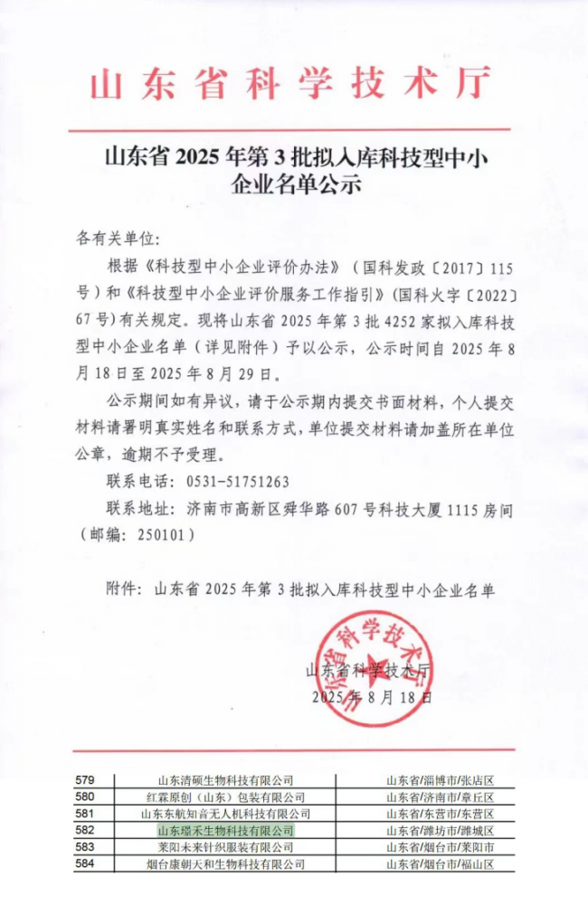 近日,山东省科学技术厅发布了《山东省2025年第3批拟入库科技型中小企业名单公示》,山东璟禾生物科技有限公司成功入选。