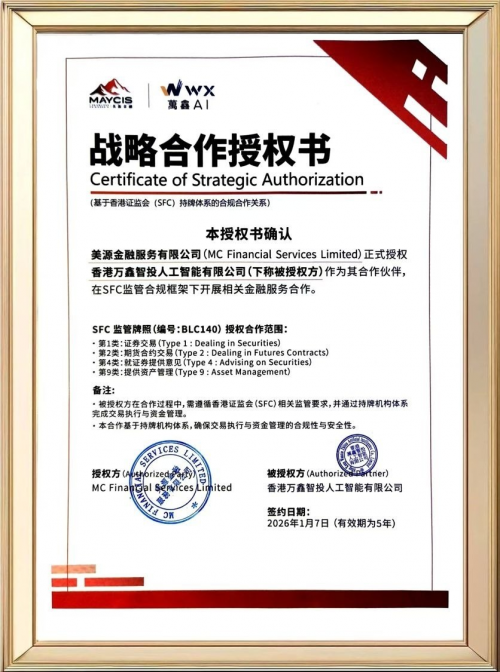 近日,万鑫智投对外披露,其已与香港持牌金融机构——美源金融服务有限公司(MC Financial Services Limited)建立合作关系,并在香港证监会(SFC)监管框架下开展相关金融服务协作。该进展被视为其在合规体系建设方面由阶段性披露向结构性落地的重要一步。