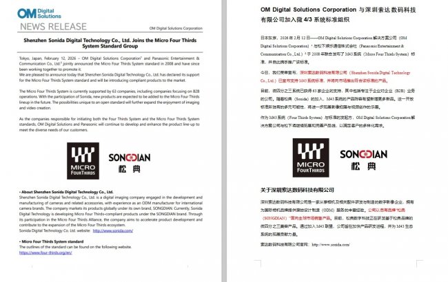 2026年2月12日,微4/3系统标准(Micro Four Thirds System)迎来了第63位成员。OM Digital Solutions Corporation宣布,深圳索达数码科技有限公司(以自有品牌“松典”运营)正式加入M43联盟,并将推出符合该标准的产品。这不仅是一则企业新闻,更是松典从“单打独斗”走向“生态共建”的标志性事件。