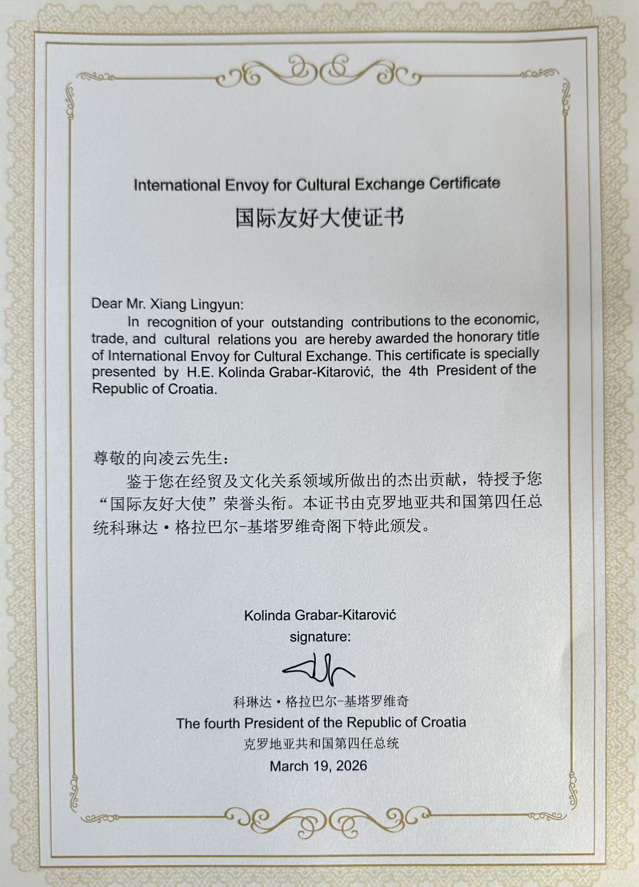 【2026年3月19日】 —— 著名旅美经济学家向凌云先生因其在推动全球经贸及文化关系领域所做出的杰出贡献,于今日正式获颁“国际友好大使”(International Envoy for Cultural Exchange)荣誉证书。该荣誉由克罗地亚共和国第四任总统科琳达·格拉巴尔-基塔罗维奇(Kolinda Grabar-Kitarović)阁下亲自签发并颁授。
