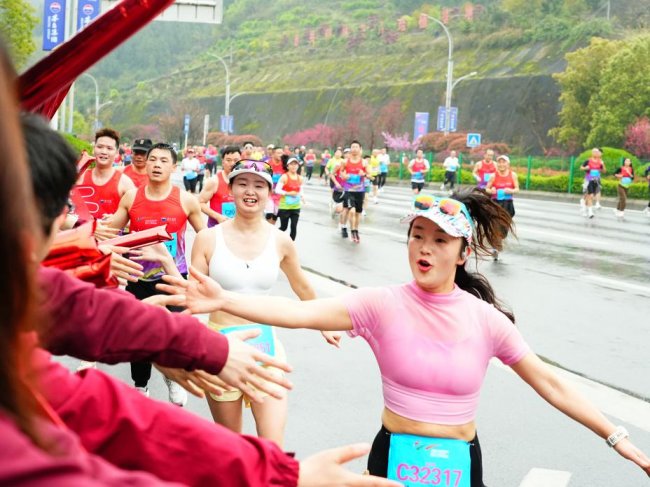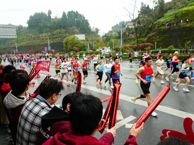 随着发令枪响,参赛选手们迈着坚定的步伐途经助威点位,瞻云酒业助威团的热情瞬间被点燃。铿锵有力的加油口号响彻赛道上空,队员们挥舞着加油棒与品牌旗帜,鲜红的身影在赛道旁熠熠生辉,成为赛事中一道极具感染力的风景线。尽管清晨寒意未消,但大家的热情丝毫未减,与途经选手击掌互动、呐喊鼓劲,用真诚的陪伴与坚定的支持,为选手们缓解疲惫、注入前行力量,让每一位跑者都能感受到酒都本土企业的温暖与诚意。
