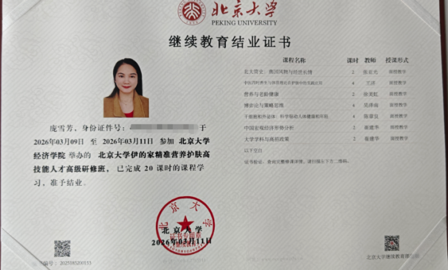 2026年3月,雪缘老师参加了北京大学经济学院举办的"伊的家精准营养护肤高技能人才高级研修班",完成了20课时的课程学习并获得结业证书。这一研修班的核心议题是"肽类赋能·细胞抗衰与皮肤健康研讨会",体现了她对前沿护肤科学技术的关注。