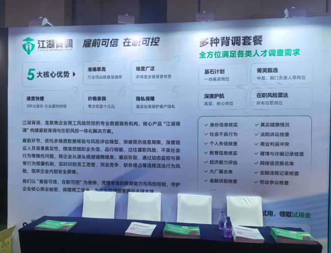 在大会的科技展示环节,江湖背调凭借其自主研发的数字化风险控制系统,向与会政府领导、专家学者及数千名企业代表展示了如何利用 AI 与大数据构建透明、公正的职业信用体系。