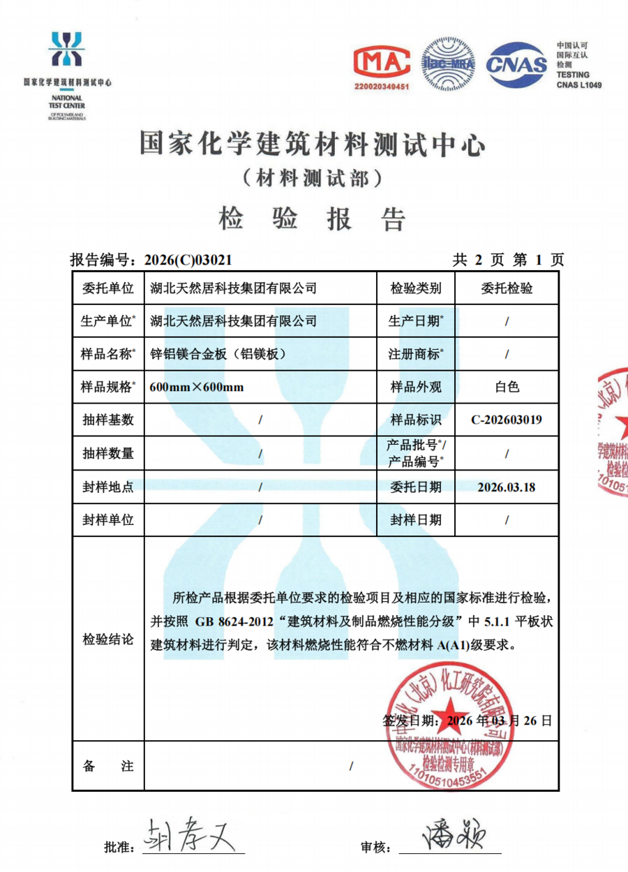 - 技术革新引领行业升级 湖北天然居锌铝镁家居斩获 A1 级防火等三项权威认证2026-03-31