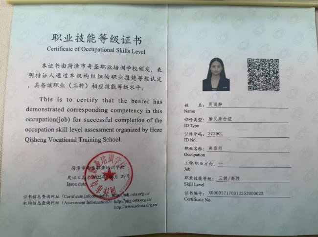 吴丽静美容师证书