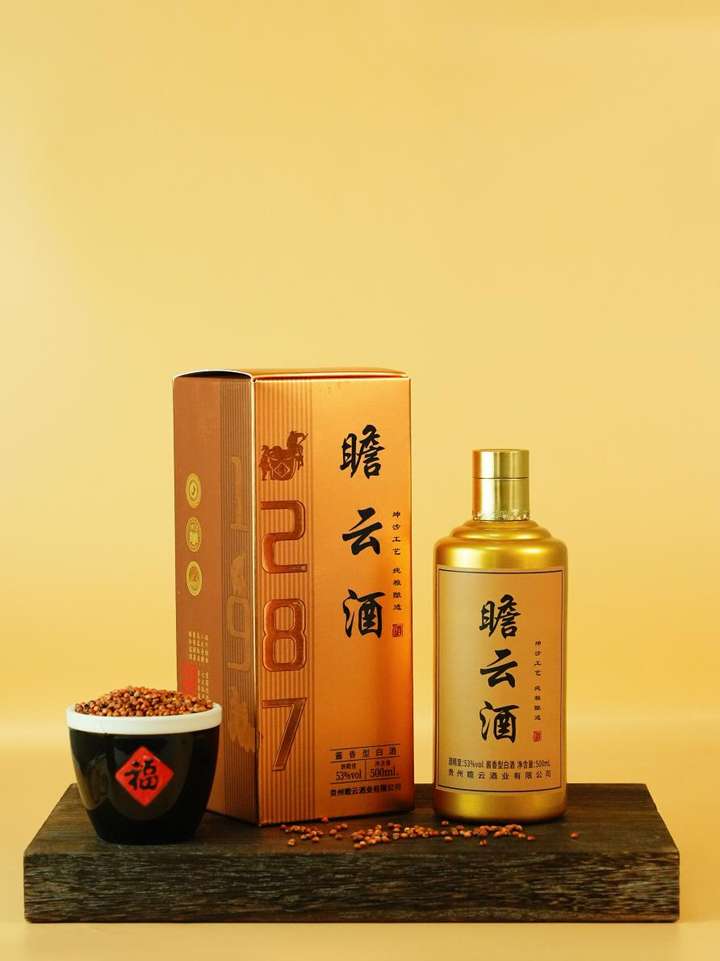 本次通过赋码认证的瞻云酒(赋码款),是瞻云酒业全新推出的核心旗舰产品,金色瓶身与质感礼盒交相辉映,盒身醒目的 “12987” 数字标识,直观展现酱酒传承千年的传统酿造工艺,瓶身与礼盒均清晰标注“坤沙工艺 纯粮酿造”,酒精度 53% vol,净含量 500ml,由贵州瞻云酒业有限公司全程匠心生产出品。产品删繁就简、定价亲民,是集外观颜值、酿造品质与市场性价比于一体的诚意之作。