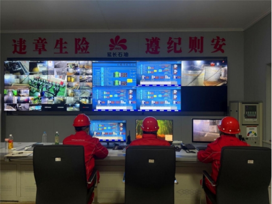 图为延长油田靖边采油厂天赐湾联合站中控室职工认真观察生产设备运行状况并核对资料数据(王院院 摄)