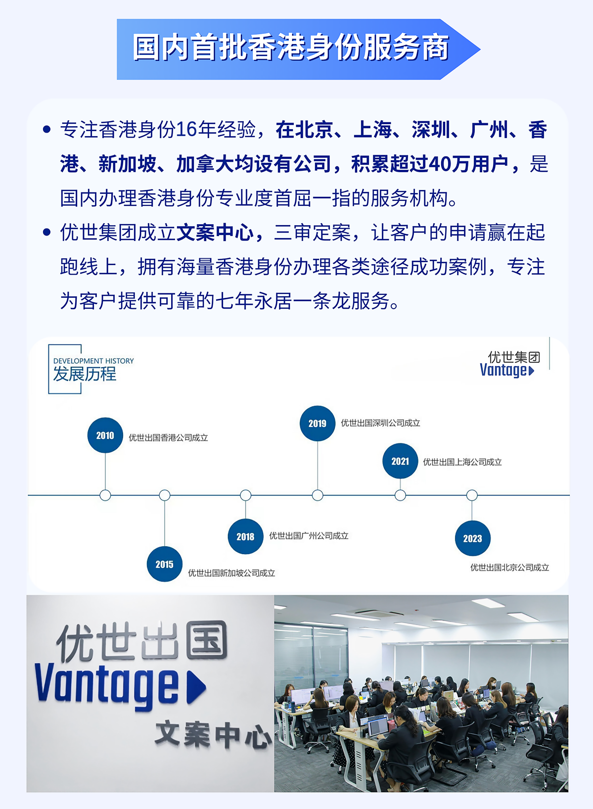 十六载砥砺前行,优世出国集团的发展脉络清晰镌刻着行业领军者的成长足迹。集团旗下涵盖优世出国、优世教育、优世商务等多元实力品牌,分支机构覆盖国内香港、广州、深圳、上海,及海外新加坡、加拿大等国家和地区,是国内首批、辐射全国的优质香港人才引进服务机构。